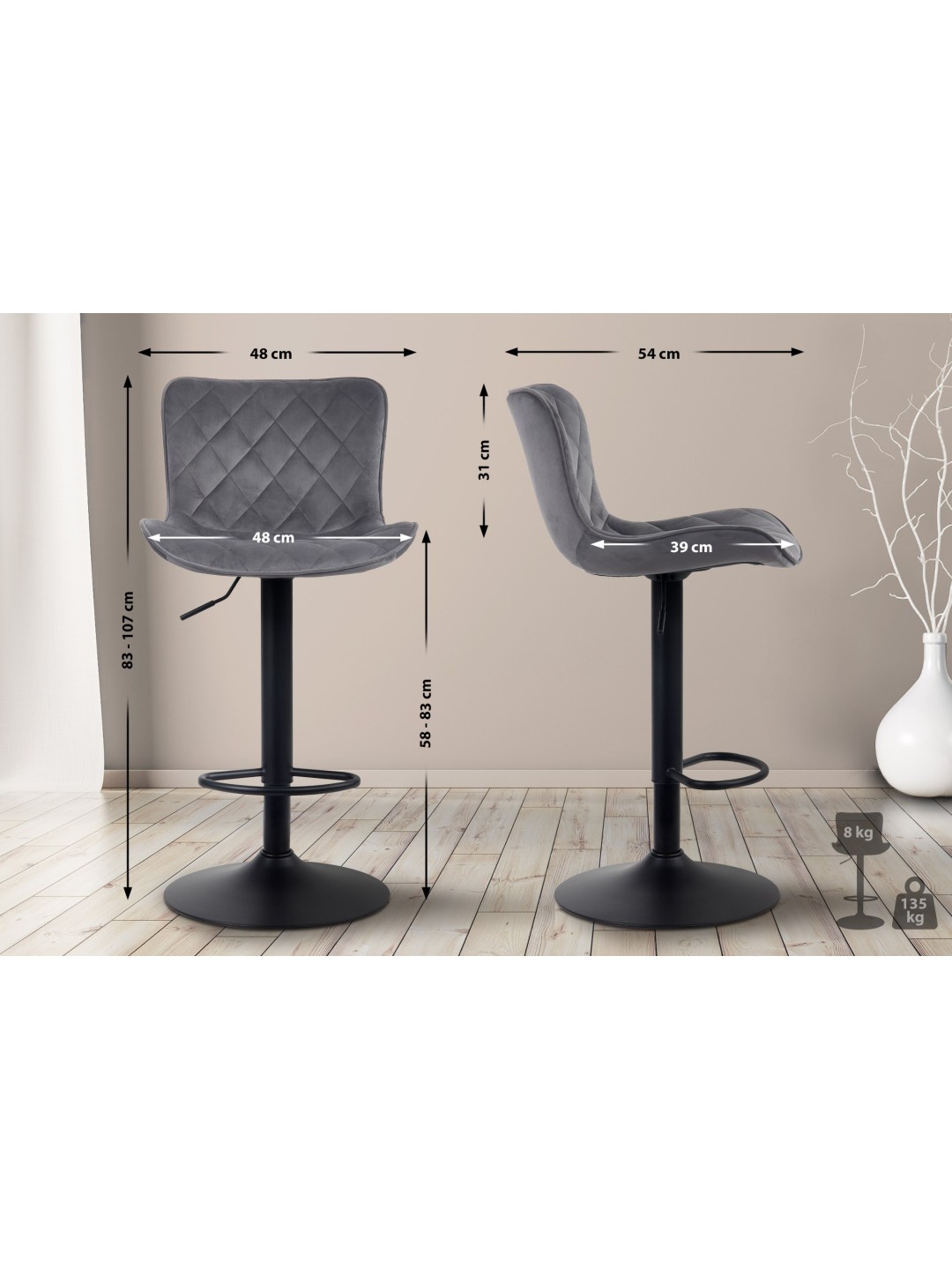 Trubkové nožičky umožňujú otáčanie o 360°. Pultové stoličky sú tiež výškovo nastaviteľné a vďaka svojim stabilným kovovým nožičkám ponúkajú bezpečný stojan.